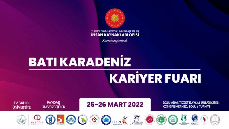 Cumhurbaşkanlığı İnsan Kaynakları Ofisi tarafından “Yetenek Her Yerde” temasıyla gerçekleştirilecek olan “Batı Karadeniz Kariyer Fuarı”, 25-26 Mart 2022 tarihinde Bolu Abant İzzet Baysal Üniversitesi ev sahipliğinde 17 paydaş üniversite ve meslek odalarının işbirliği ile düzenlenecektir.