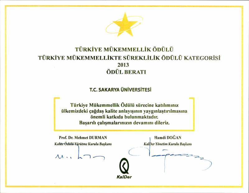Üniversitemiz tüm idari birimlerinde TS-EN-ISO 9001:2000 kalite belgesine sahiptir.Ayrıca Üniversitemiz, EFQM Mükemmel Modeli çerçevesinde (European Foundation for Quality Management Excellence Model) dış değerlendirmesi sonucunda Ulusal Kalite Büyük Ödülü almıştır.