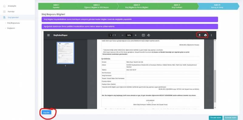 ADIM 5: Sonuç-Onay Bu alanda sistem tarafından otomatik oluşturulan Staj Kabul Formunun çıktı veya indirme işlemini gerçekleştirebilirsiniz. Çıktısını aldığınız Staj Kabul Formunu staj yapmak istediğiniz kuruma ıslak imza ile (Firma Kaşe ve var ise Mühür işlemi de bu alanda yapılmalıdır.) onaylatmanız gerekmektedir. “KAYDET” butonuna basarak başvuru ilk aşamasını tamamlayınız.