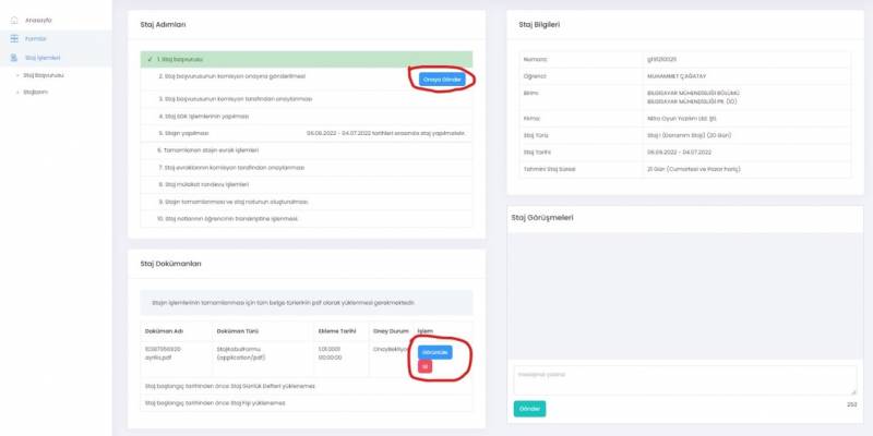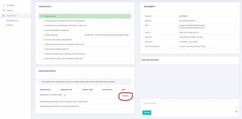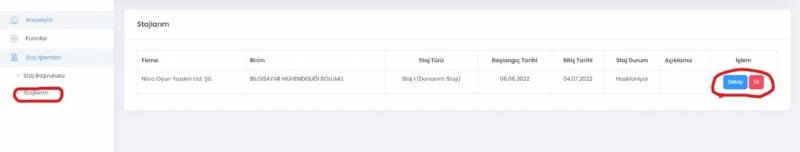 DETAY butonuna tıklayarak ADIM 5’te çıktısını aldığınız Staj kabul formunun Firmaya onaylatılmış halini sisteme yükleyebilir ve stajınızı, Staj Komisyonu onayına sunabilirsiniz.