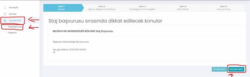 Staj İşlemleri Kutucuğu altında yer alan Staj Başvurusu linkine tıklayınız. Açılan Ekranda “ADIM 1” Bölümün yayınlamış olduğu staj duyuru metnini okuyunuz ve “Sonraki Adım” ikonuna tıklayarak Adım 2 ye geçiniz.