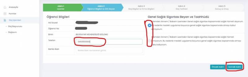 ADIM 2: Öğrenci Bilgileri ve GSS Beyan Bu alanda Telefon numara bilgilerinizi giriniz IBAN Numarası bilgisi girmenize gerek yoktur. Son olarak Genel Sağlık Sigortası beyanıyla ilgili durumunuza uyan kutucuğu işaretleyerek “Sonraki Adım” ikonuna tıklayınız ve Adım 3’e geçiniz.