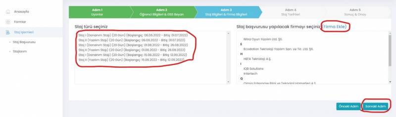 NOT: Eğer staj yapmak istediğiniz firma listede bulunmuyorsa, “FİRMA EKLE” butonundan staj yapmak istediğiniz kurum bilgilerini girerek kaydediniz. Bu durumda staj yapacağınız firma staj komisyonu onayına düşecektir. Komisyon belirttiğiniz firma kaydını onaylaması durumunda başvuru işleminize devam edebilirsiniz. Firma reddedilmesi durumunda bu firmada staj yapamazsınız.
