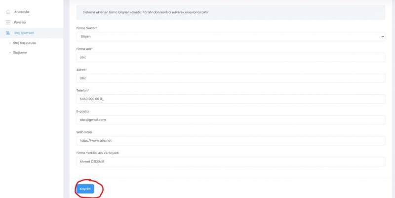 NOT: Kaydet Butonuna tıkladıktan sonra staj yapacağınız firma staj komisyonu onayına düşecektir. Komisyon belirttiğiniz firma kaydını onaylaması durumunda başvuru işleminize devam edebilirsiniz. Firmanın reddedilmesi durumunda bu firmada staj yapamazsınız.