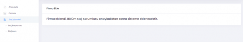 Kaydet dedikten sonra ekran aşağıdaki duruma dönüşecektir. Firmanın onaylanıp onaylanmama durumunu Staj Başvuru ekranından takip edebilirsiniz.