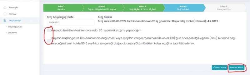 ADIM 4: Staj Tarihleri Bu alanda Staj Başlangıç tarihinizin kontrolünü gerçekleştiriniz. (Staj bitiş tarihi otomatik olarak hesaplanacaktır.) Sonra staj ile ilgili taahhüt onay kutucuklarını işaretleyerek Sonraki Adım ikonuna tıklayarak ADIM 5’e geçiniz.